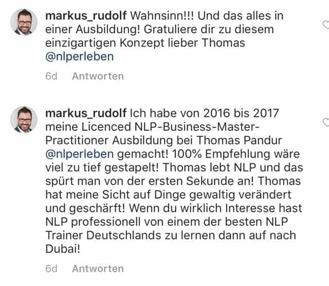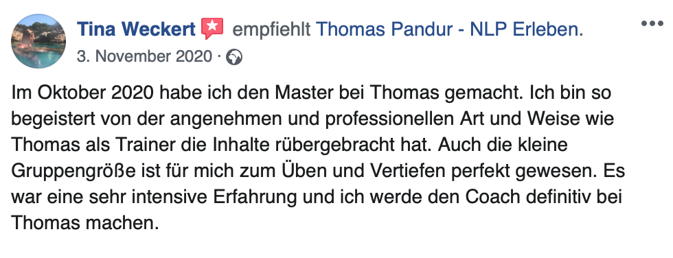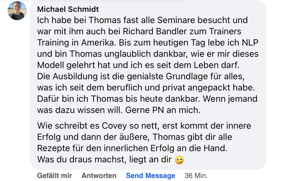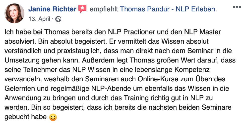 An alle die sich fragen, ob NLP eine Bereicherung für ihr Leben sein kann und das Leben direkt und einfach verbessern kann: Gebt euch selbst die Chance und investiert einen Tag eurer Lebenszeit für das Seminar. Ihr werdet es nicht bereuen und direkt einen positiven Unterschied in eurem Alltag feststellen können. Thomas zeigt die NLP-Techniken in einer Art und Weise, die nicht viel mit Erzählen zu tun hat. Hier geht es wirklich darum, NLP sofort anzuwenden und einen positiv spürbaren Unterschied zu machen…